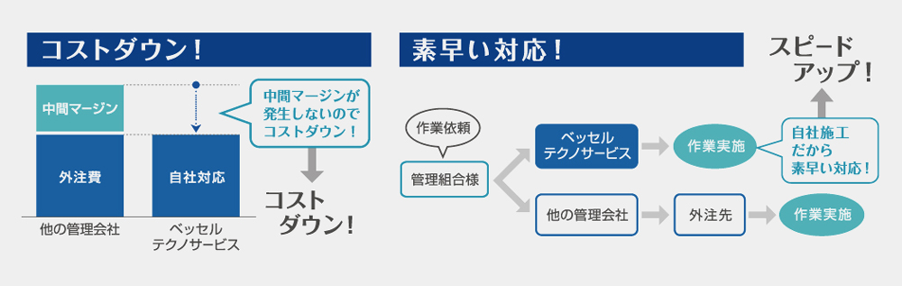 自社での「トータル管理」で「安心のマンションライフ」をご提案します。 ベッセルテクノサービスはビルメンテナンス会社です。清掃・設備業務等を自社で行うことができますので、中間マージンが発生せず無駄な経費を抑え、さらに素早い対応が可能です。