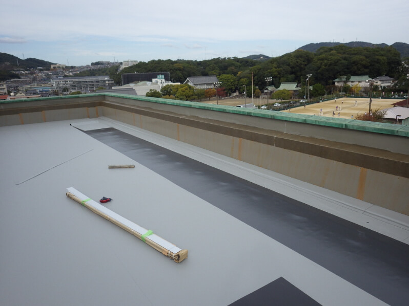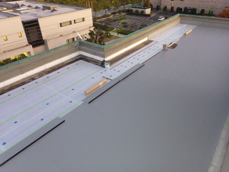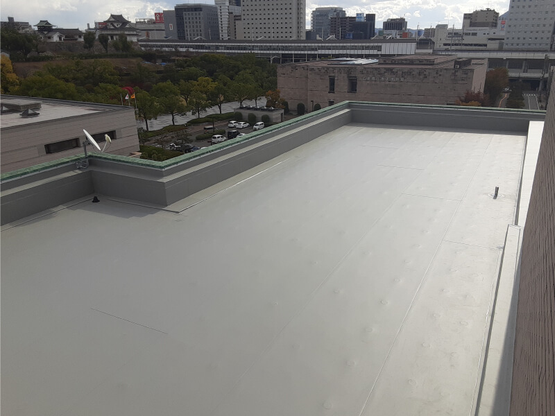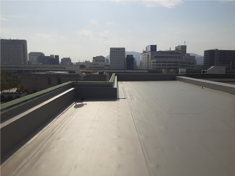 既存の防水層をいかし、塩ビシートを機械式固定工法により強い防水層を形成しました。この工法により、通常の工事より撤去廃材を少なくすることができます。施工後の写真のように美観が新築時のようによみがえりました。