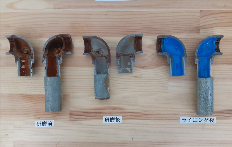 劣化した給排水管は内部に錆が発生します。内部のサビを取り除き補強することで配管を長持ちさせます。